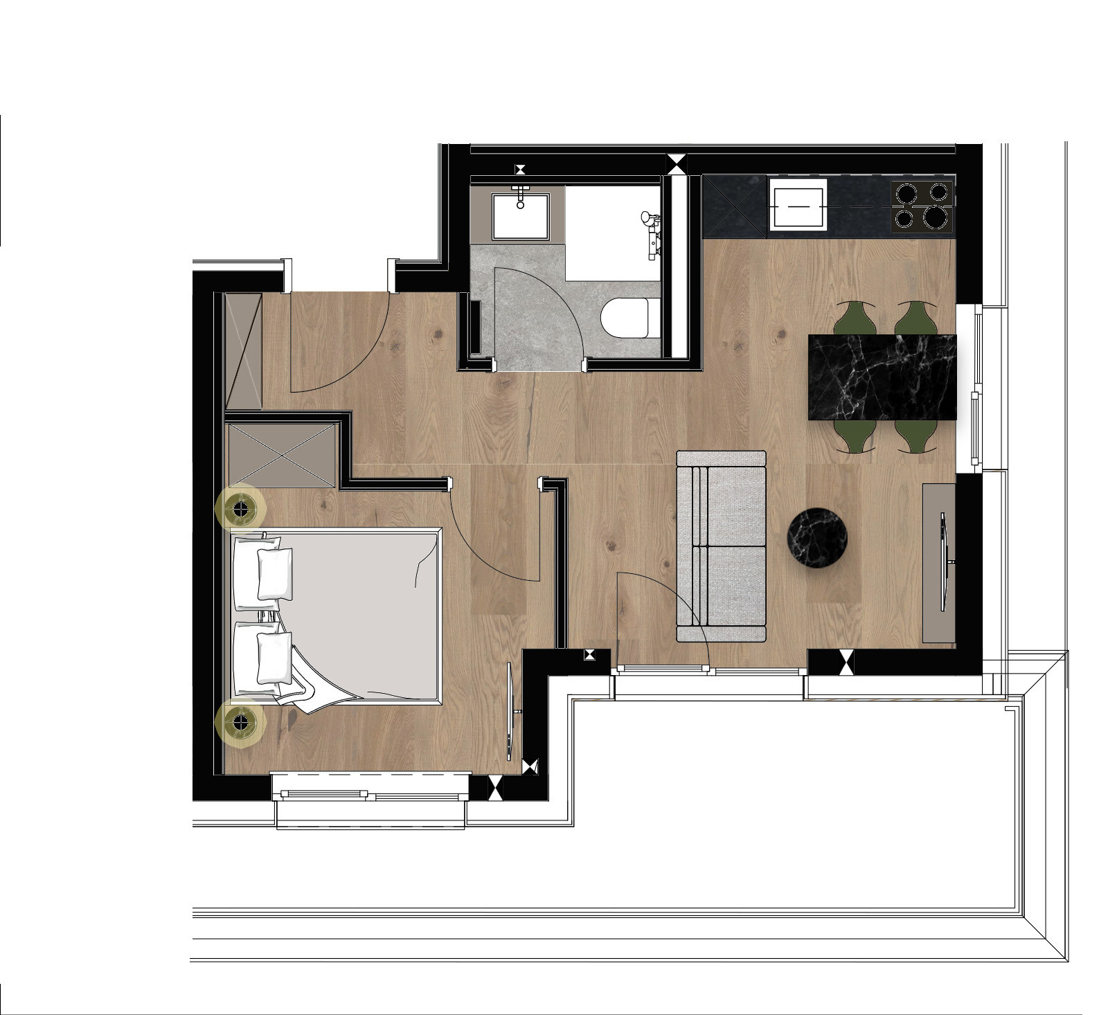 The "Peak Happiness Comfort" apartment is ideal for families or friends. It offers space for up to four people and includes a bedroom with a double bed, a double sofa bed in the living room, an open-plan living kitchen and a modern bathroom with shower. -