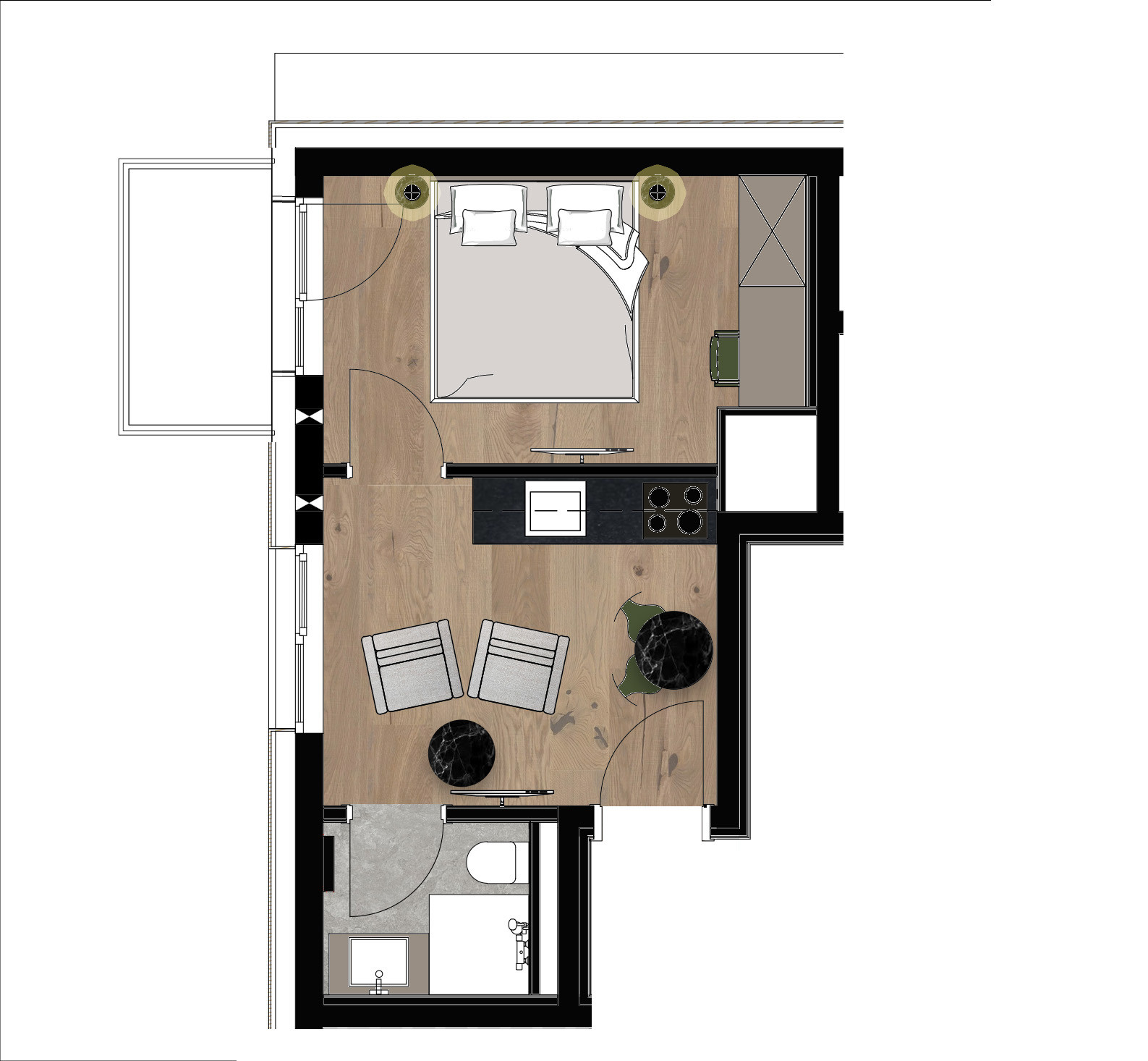 The "Peak Happiness Classic" apartment is perfect for a couple or friends and offers space for 2 people. It features a cosy bedroom with a double bed, a single sofa bed in the living room, an open-plan living kitchen and a modern bathroom with shower.