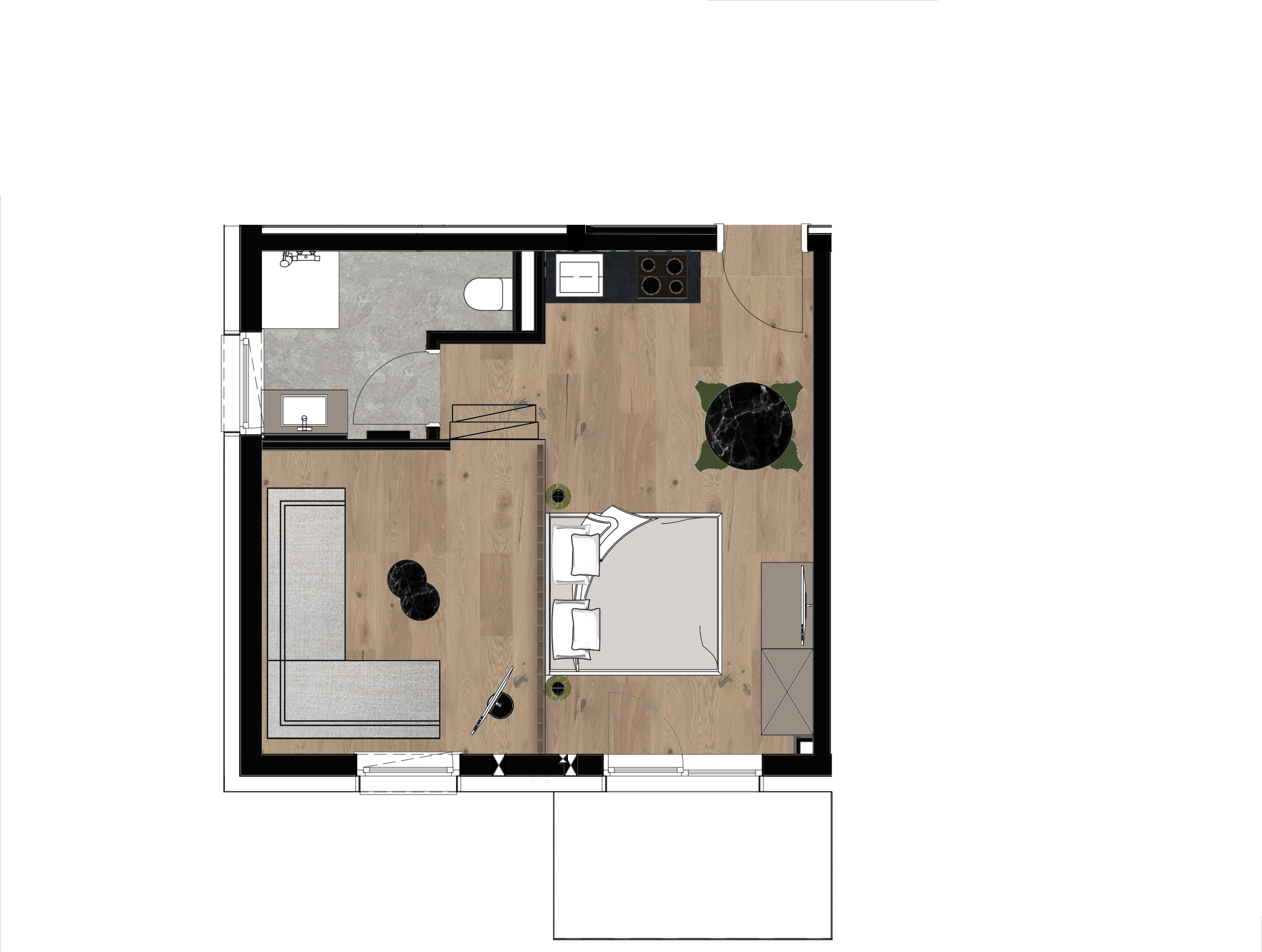 Ich persönlich würde es besser finden wenn das Bett und das Sofa die Röume tauschen würden. Dann könnte der Langschläfer besser weiter schlafen während der Frühaufsteher sich in Ruhe seinen Kaffee macht. Ein Pfannenwender würde die gut ausgestattet Küche dann noch vervollständigen.