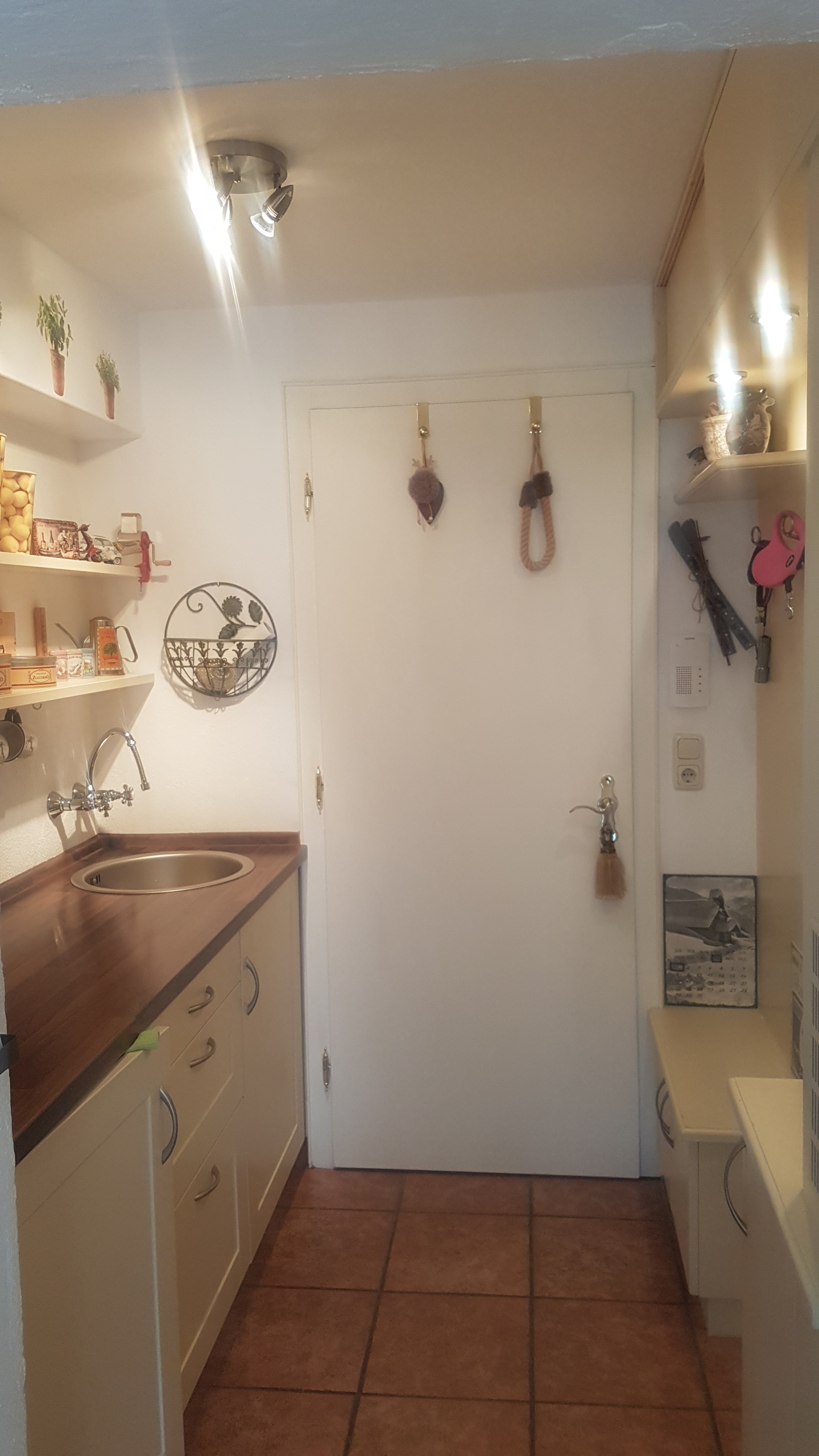 • Küchenzeile mit Kochplatte, Kühlschrank, Wasserkocher und Kaffeemaschine sowie allem Kochzubehör